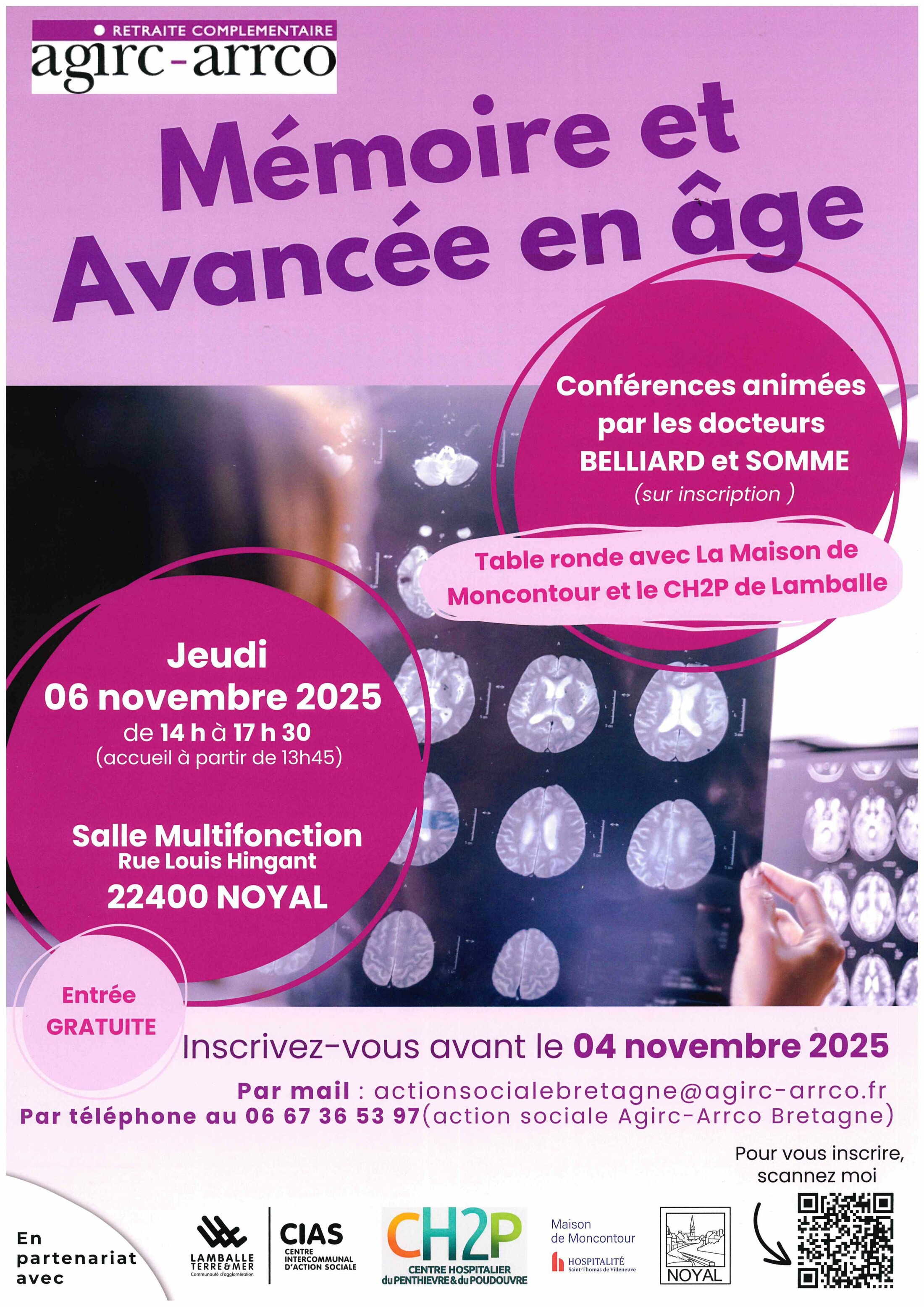 Les deux conférences se tiendront le jeudi 06 novembre 2025 de 14h00 à 17h30 (accueil à partir de 13h45) à la salle multifonction de Noyal, en partenariat avec le Contrat Local de Santé de Lamballe Terre et Mer, le Centre Inter Communal d'Action Sociale Lamballe Terre et Mer. L'entrée est gratuite sur inscription avant le 04 novembre.