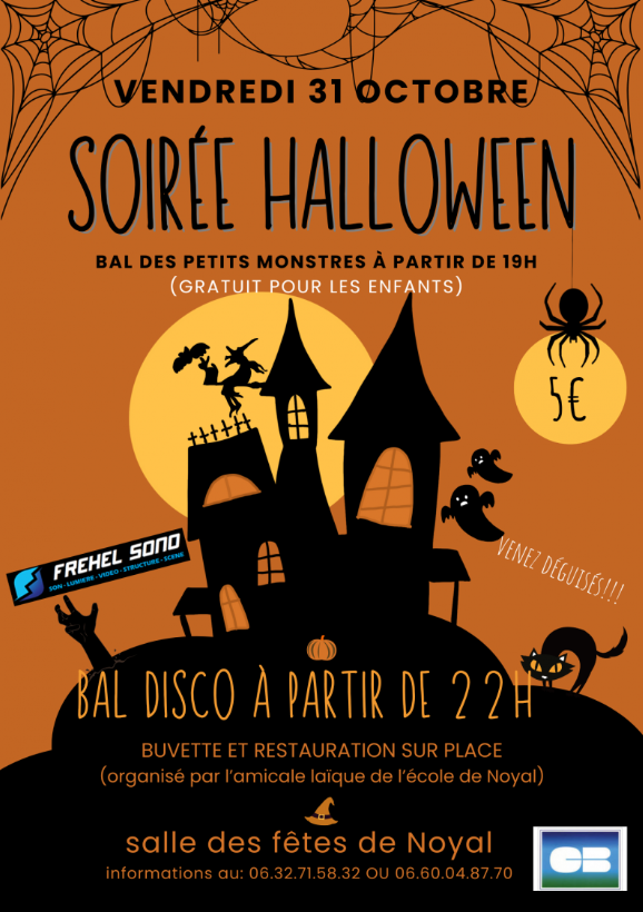 L'Amicale Laïque vous invite à sa fête d'Halloween ouverte à tous, petits et grands le 31 octobre à la salle des fêtes de Noyal. Au programme, bal disco à partir de 22h00, déguisements pour toute la famille, buvette et restauration sur place pour partager un moment festif qui fera danser les monstres jusqu'au bout de la nuit.