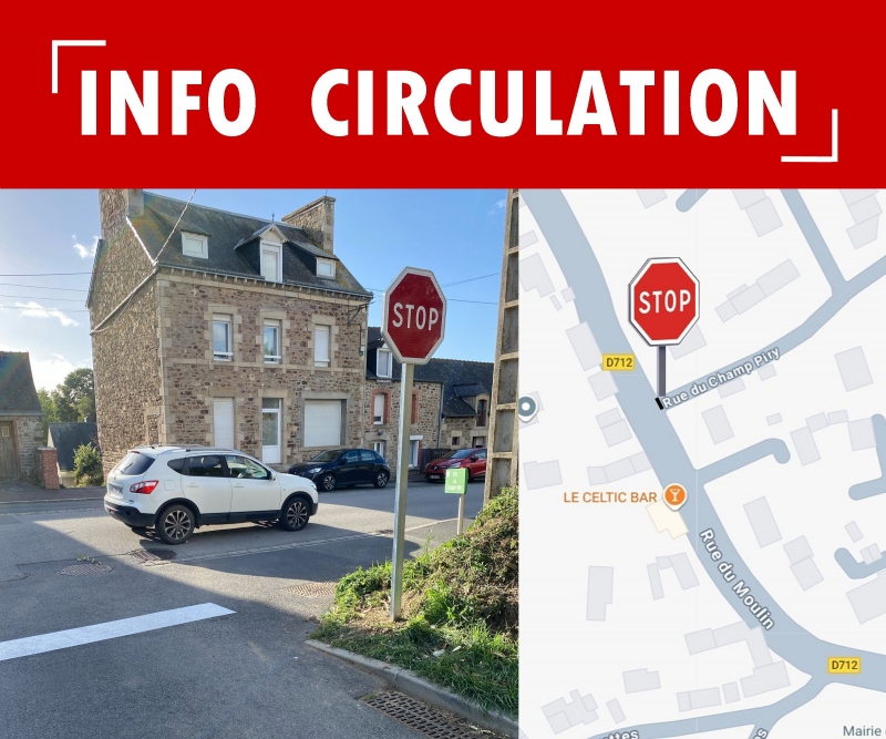 La mise en place d'un panneau STOP et d'une signalisation horizontale matérialisée par une ligne blanche viennent modifier les conditions de circulation pour contraindre les usagers circulant sur la voie communale descendant du Champ Piry à marquer un temps d'arrêt obligatoire et de céder le passage aux véhicules circulant sur la route départemental D712. Pour lire l'arrêté municipal>>>>